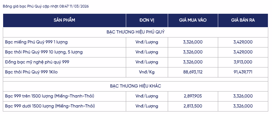 Cùng lúc đó, giá bạc hôm nay tại Tập đoàn Vàng bạc Đá quý Phú Quý, giá bạc niêm yết ở mức 3,32 triệu đồng/lượng (mua vào) và 3,429 triệu đồng/lượng (bán ra) tại Hà Nội. Trong khi đó, bạc thỏi 999 loại 1kg của thương hiệu này được giao dịch ở mức 88,6 - 91,4 triệu đồng/kg.