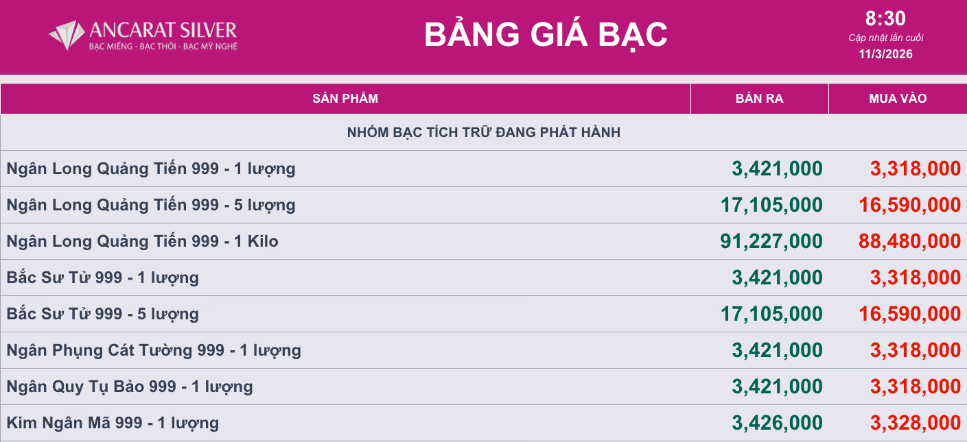 Tại Công ty cổ phần Kim loại quý Ancarat, giá bạc miếng 999 loại 1 lượng niêm yết ở mức 3,318 - 3,421 triệu đồng/lượng. Còn bạc thỏi 999 loại 1kg được giao dịch quanh ngưỡng 88,4 - 91,2 triệu đồng/kg (mua - bán).