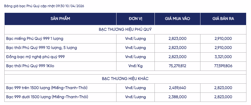 Ở phân khúc bạc miếng, giá bạc Phú Quý 999 hiện được niêm yết tại 2,82 triệu đồng/lượng (mua vào) và 2,91 triệu đồng/lượng (bán ra). Trong khi đó, bạc thỏi 999 loại 1kg của thương hiệu này được giao dịch ở mức 75,2 - 77,5 triệu đồng/kg.