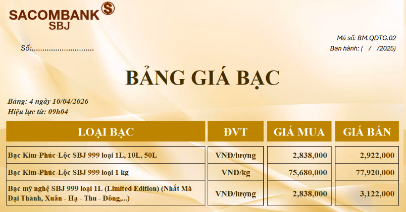 Công ty Vàng bạc - Đá quý Sacombank (SBJ) niêm yết giá bạc mua vào 2,79 triệu đồng/lượng, bán ra 2,87 triệu đồng/lượng, giảm 80.000 đồng/lượng so với cuối ngày trước. Đối với bạc thỏi 999 loại 1kg, thương hiệu này cũng ghi nhận mức giảm, hiện giao dịch tại 75,6 - 77,9 triệu đồng/kg.