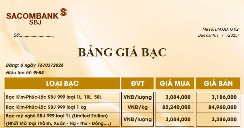 Tại Sacombank-SBJ, giá bạc miếng 999 loại 1 lượng được niêm yết ở mức 3,084 - 3,186 triệu đồng/lượng (mua – bán). Đối với bạc thỏi 999 loại 1kg, thương hiệu này cũng ghi nhận mức tăng đáng kể, hiện giao dịch tại 82,2 - 84,9 triệu đồng/kg.