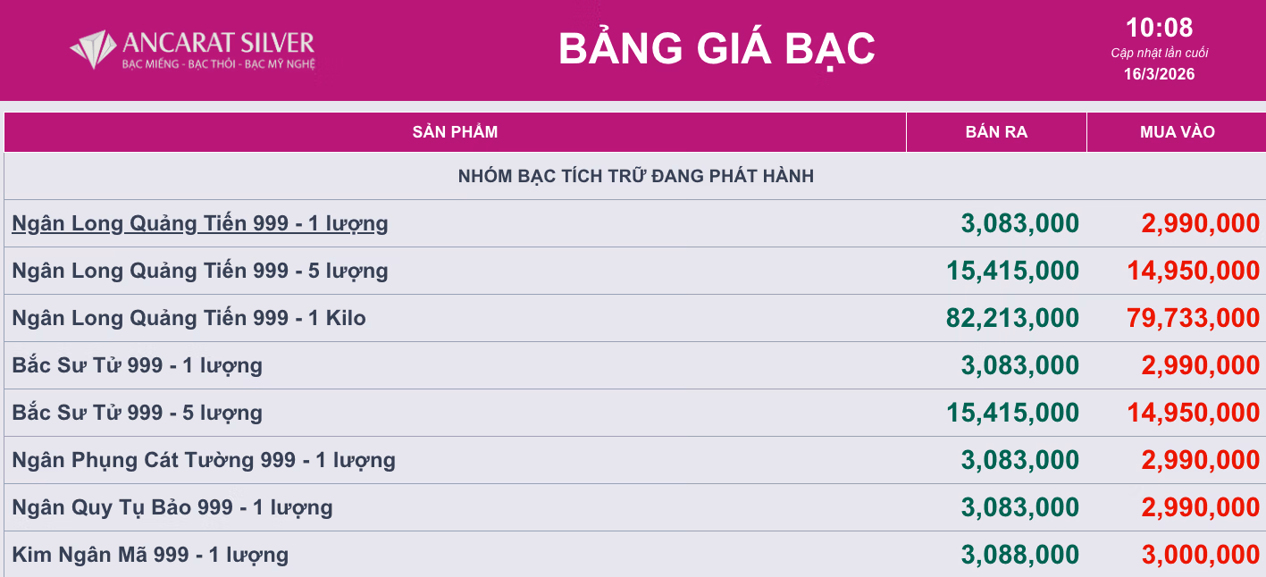 Tại Ancarat, thị trường bạc cũng diễn biến tương tự. Giá bạc miếng 999 loại 1 lượng được giao dịch ở mức 2,99 - 3,083 triệu đồng/lượng (mua – bán). Giá bạc thỏi 999 loại 1kg của Ancarat cũng ghi nhận mức tăng mạnh, giao dịch tại 79,7 - 82,3 triệu đồng/kg.