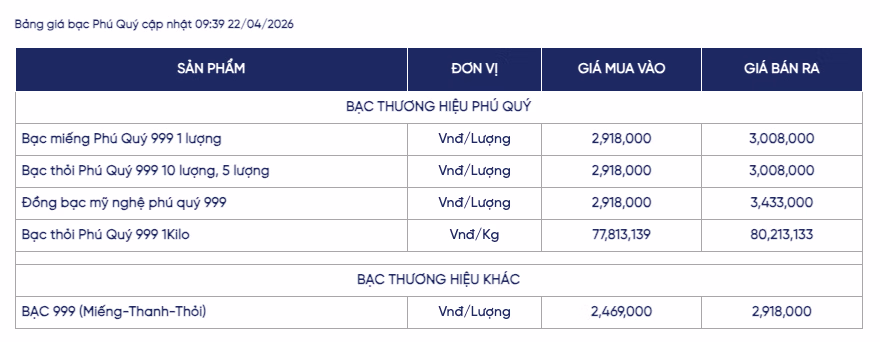 Ở phân khúc bạc miếng, giá bạc Phú Quý 999 hiện được niêm yết tại 2,91 triệu đồng/lượng (mua vào) và 3 triệu đồng/lượng (bán ra). Trong khi đó, bạc thỏi 999 loại 1kg của thương hiệu này được giao dịch ở mức 77,8 - 80 triệu đồng/kg.