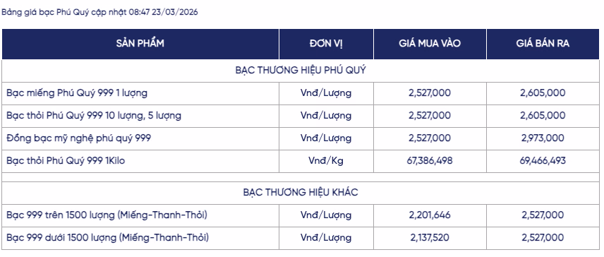 Ở phân khúc bạc miếng, giá bạc Phú Quý 999 hiện được niêm yết tại 2,52 triệu đồng/lượng (mua vào) và 2,6 triệu đồng/lượng (bán ra). Trong khi đó, bạc thỏi 999 loại 1kg của thương hiệu này được giao dịch ở mức 67,3 - 69,4 triệu đồng/kg.