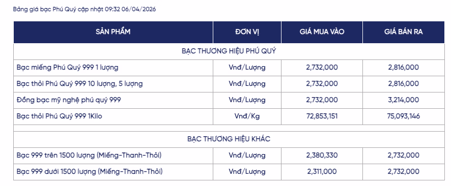 Ở phân khúc bạc miếng, giá bạc Phú Quý 999 hiện được niêm yết tại 2,73 triệu đồng/lượng (mua vào) và 2,81 triệu đồng/lượng (bán ra). Trong khi đó, bạc thỏi 999 loại 1kg của thương hiệu này được giao dịch ở mức 72,8 - 75 triệu đồng/kg.