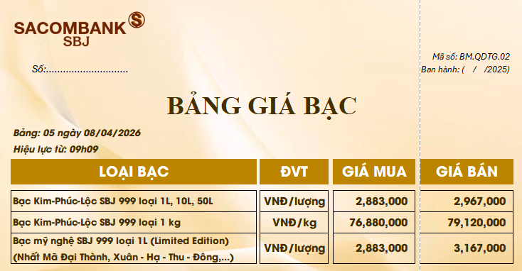 Tại Sacombank - SBJ, giá bạc miếng 999 loại 1 lượng được niêm yết ở mức 2,83 - 2,96 triệu đồng/lượng (mua - bán). Đối với bạc thỏi 999 loại 1kg, thương hiệu này cũng ghi nhận mức giảm, hiện giao dịch tại 76,8 - 79,1 triệu đồng/kg.