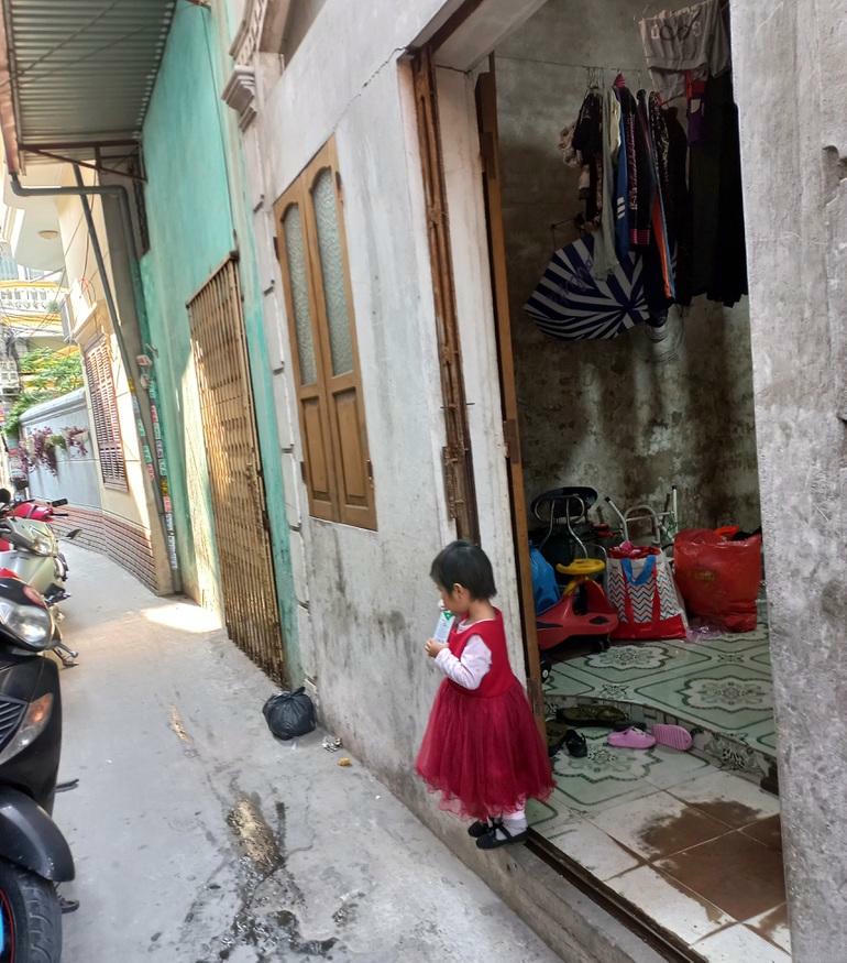 Bé P.L. chơi nhởn nhơ một mình quanh căn nhà cũ kỹ, chật chội nơi ngõ nhỏ.