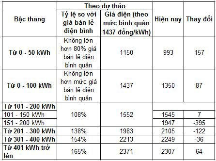Ở bậc thang đầu tiên dành cho các hộ thu nhập thấp sử dụng không quá 50 kWh mỗi tháng và đã đăng ký với ngành điện, giá điện không lớn hơn 80% giá bán lẻ bình quân. Giả dụ với giá bán lẻ bình quân không đổi (là 1.437 đồng/kWh - chưa bao gồm thuế VAT), mỗi hộ gia đình này sẽ phải trả tối đa 1.150 đồng/kWh, thay vì 993 đồng như hiện nay.