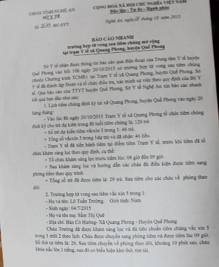 Trước đó, sáng ngày 20/10 đơn vị này nhận được thông báo qua điện thoại của Trung tâm y tế huyện Quế Phong vào hồi 10h ngày 20/10, cháu bé Lô Tuấn Trường (3 tháng tuổi) con anh Lô Văn Mười (trú tại xã Quang Phong, Quế Phong) tử vong sau khi tiêm chủng thường xuyên tại Trạm y tế xã.