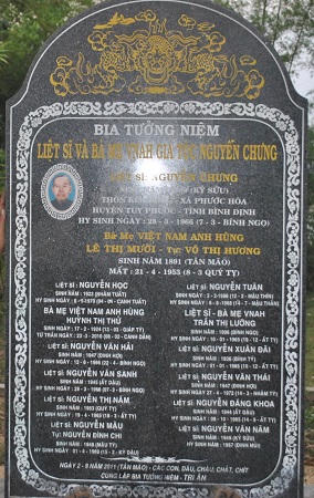 (PLO) -Khu vườn của gia đình liệt sĩ Nguyễn Chưng (ở xã Phước Hòa, huyện Tuy Phước, tỉnh Bình Định) nằm lọt thỏm giữa vùng đất trũng của thôn Kim Đông, đằng trước là đồng ruộng, phía sau là dòng sông. Tại khu vườn, bia tưởng niệm gia tộc được xây dựng kiên cố ở nơi trang nghiêm nhất. Trên bia khắc đầy đủ tên 12 liệt sĩ, trong đó có 3 người vừa là liệt sĩ, vừa là mẹ Việt Nam anh hùng.