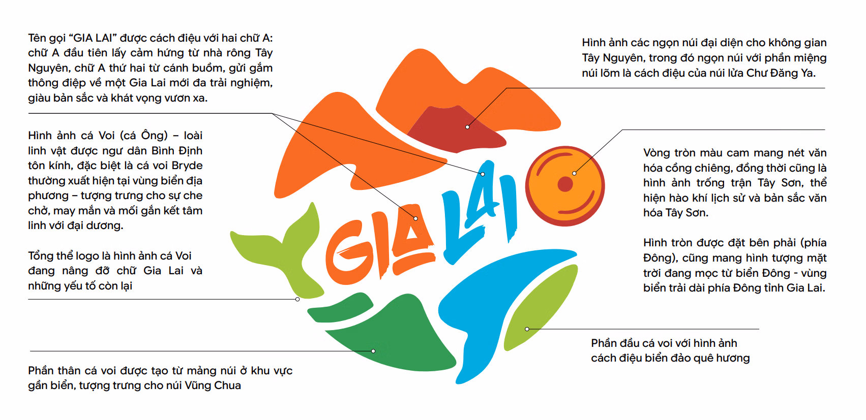 Tên gọi “GIA LAI” được cách điệu với hai chữ A: chữ A đầu tiên lấy cảm hứng từ nhà rông Tây Nguyên, chữ A thứ hai từ cánh buồm, gửi gắm thông điệp về một Gia Lai mới đa trải nghiệm, giàu bản sắc và khát vọng vươn xa.