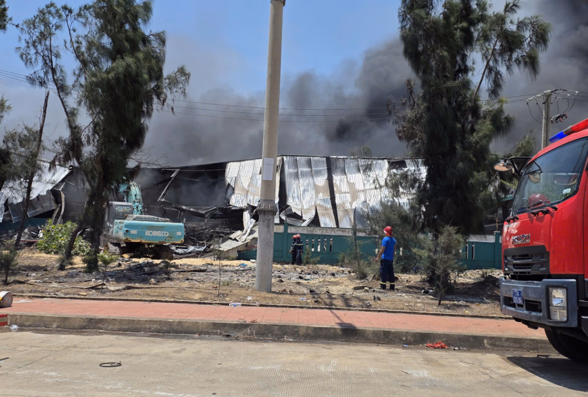Đến khoảng 10h sáng cùng ngày, ngọn lửa vẫn còn cháy âm ỉ. Lực lượng chức năng phải sử dụng máy múc phá dỡ một phần khung nhà xưởng để tiếp cận sâu bên trong, xử lý các điểm cháy còn sót lại.