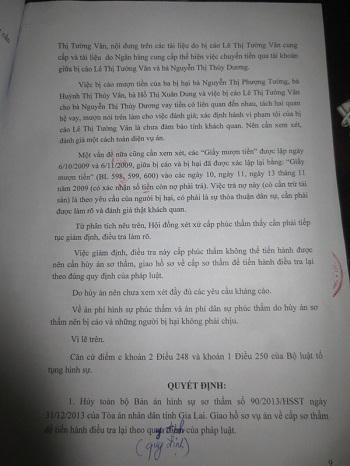 Cũng trong phiên tòa phúc thẩm lần 1, TANDTC nhận định: “Những nội dung tin nhắn của bị cáo Tường Vân gửi cho Thùy Dương và ngược lại, từ ngày 6/11/2009 đến ngày 14/11/2009 hay những con số tính toán trong ngày 2/11/2009 do chính Thùy Dương ghi trên tờ lịch chưa thể nói Thùy Dương không liên quan đến số tiền nợ hiện tại của bị cáo”. Như vậy, việc các cơ quan tố tụng tỉnh Gia Lai “loại” Thùy Dương ra khỏi vụ án bị tố là lừa đảo, chiếm đoạt tài sản này là không thỏa đáng.