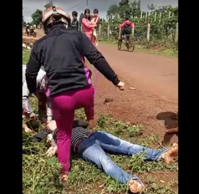 Chưa dừng lại ở đó, khi người phụ nữ bị đánh ngất xỉu, không còn khả năng chống cự, nhóm người này vẫn tiếp tục dùng kéo cắt tóc nạn nhân. Đặc biệt, ở cuối clip còn thấy nhóm người kia dùng chân đạp mạnh vào vùng kín của nạn nhân để dằn mặt. Sự việc chỉ dừng lại khi nhiều người dân cùng xông vào ngăn cản và cố gắng dìu người phụ nữ bị đánh đi nơi khác.