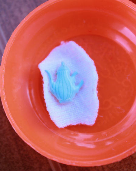 Theo quan sát “đứa bé” đựng trong một chiếc hộp nhỏ, có lót chiếc khăn nhỏ màu trắng ở phía dưới. Nhưng điều bất ngờ hơn hết, trong chiếc hộp không có “đứa con” nào cả, mà là một vật thể nhỏ bằng ngón tay út người lớn, có hình dạng một chiếc ấm nước bị gãy quai cầm. Vật thể này có màu xanh xám, vân dọc mờ.