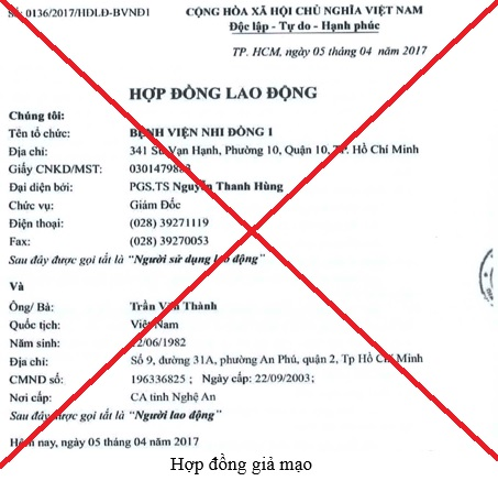 Qua kiểm tra hồ sơ nhân sự, Bệnh viện Nhi Đồng 1 cũng xác nhận Hợp đồng lao động số 0136/2017/HĐLĐ-BVNĐ1 ngày 05/04/2017 là giả mạo.