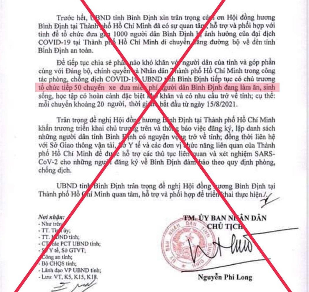 Tuy nhiên, trong những ngày qua, trên mạng xã hội và theo thông tin từ bà con tại TP HCM phản ánh thì đã có văn bản giả mạo công văn số 4920 của UBND tỉnh Bình Định (văn bản giả mạo ghi “…tỉnh tổ chức tiếp 50 chuyến xe đưa miễn phí người dân Bình Định…”). Đây là hành vi vi phạm pháp luật, giả mạo văn bản của cơ quan Nhà nước.