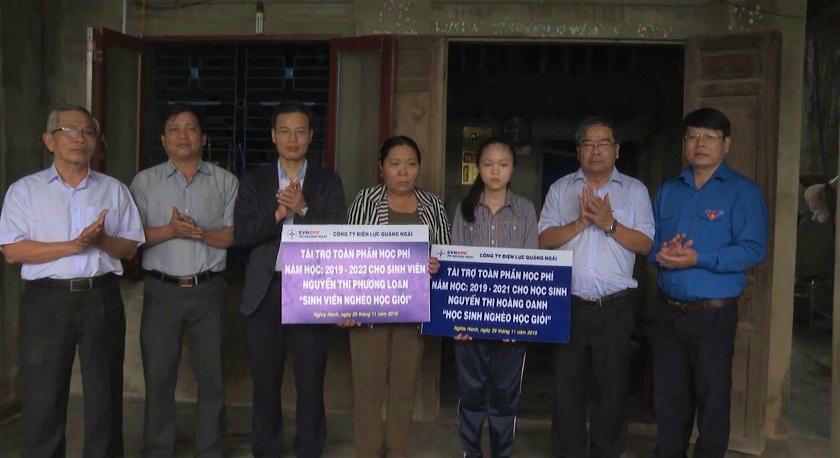 Từ đó đến nay, PC Quảng Ngãi đã nuôi và bảo trợ được 3 em học sinh với học bổng toàn phần có tổng giá trị hơn 90 triệu đồng cho đến khi ra trường. Đó là hai chị em Nguyễn Thị Phương Loan, Nguyễn Thị Hoàng Oanh ở xã Hành Thuận, huyện Nghĩa Hành và em Huỳnh Tấn Khải ở xã Bình Trị, huyện Bình Sơn, tỉnh Quảng Ngãi” - đó là chia sẻ của ông Lê Hoàng Anh Dũng, Giám đốc PC Quảng Ngãi.