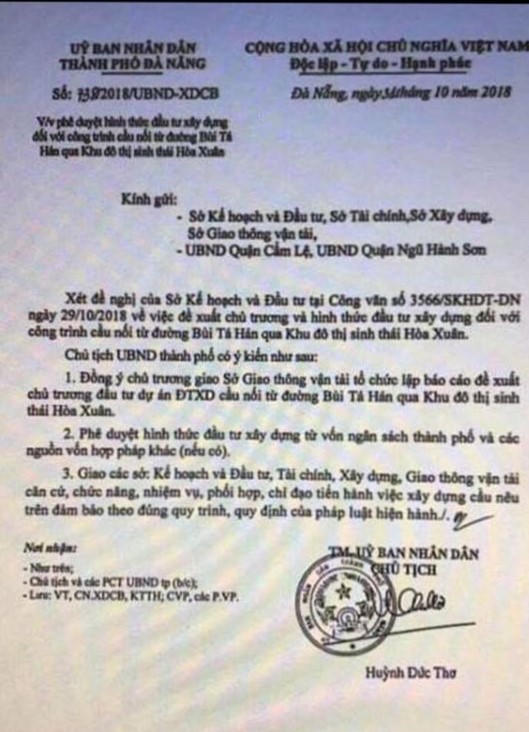 Theo đó, văn bản giả đề ban hành vào ngày 31/10/2018 có nội dung: “Chủ tịch UBND TP Đà Nẵng giao Sở Giao thông vận tải tổ chức lập báo cáo đề xuất chủ trương đầu tư xây dựng cầu nối từ đường Bùi Tá Hán sang khu đô thị sinh thái Hòa Xuân. Phê duyệt hình thức đầu tư xây dựng từ nguồn ngân sách TP và các nguồn vốn hợp pháp khác. Giao Sở Kế hoạch - đầu tư, Tài chính, Xây dựng, Giao thông vận tải căn cứ chức năng, nhiệm vụ, phối hợp, chỉ đạo tiến hành việc xây dựng cầu nêu trên đảm bảo theo đúng quy trình, quy định của pháp luật hiện hành”.