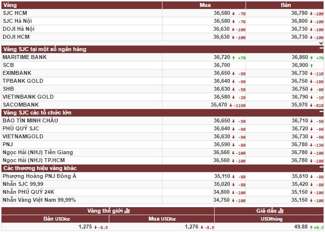 Khảo sát lúc 8h45 sáng nay (24/4), giá vàng miếng SJC niêm yết tại Công ty TNHH MTV Vàng bạc đá quý Sài Gòn - SJC ở mức 36,59-36,79 triệu đồng/lượng, giảm 70 nghìn đồng/lượng ở chiều mua vào và giảm 100 nghìn đồng/lượng chiều bán ra so với giá khảo sát sáng thứ 7 tuần trước. Chênh lệch giá mua – bán thu hẹp xuống còn 200 nghìn đồng/lượng.