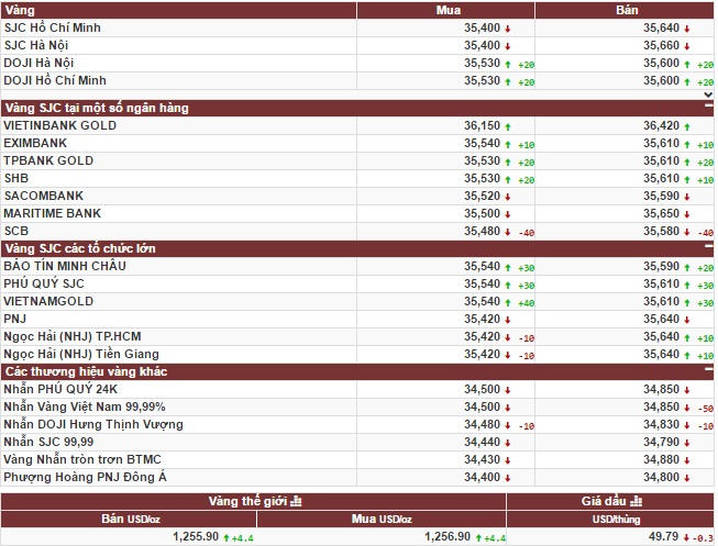Cập nhật phiên giao dịch sáng 13/10, lúc 7h30 tại thị trường TP HCM, giá vàng SJC giao dịch quanh mức 35,4 – 35,64 triệu đồng/lượng (chiều mua – bán). Giá vàng SJC giao dịch tại thị trường Hà Nội tại mức 35,4 - 35,66 triệu đồng/lượng (chiều mua – bán).