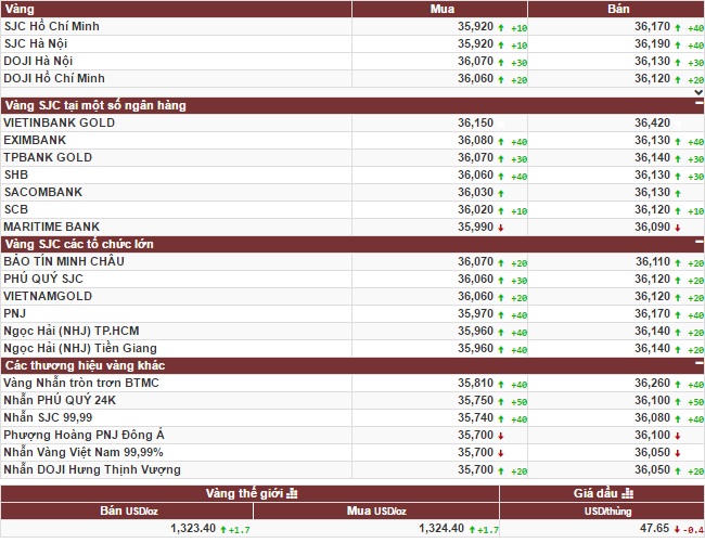 Trong khi đó, Tập đoàn DOJI niêm yết giá vàng ở mức 36,06 – 36,12 triệu đồng/lượng (mua vào – bán ra), tăng 20.000 đồng/lượng ở cả 2 chiều so với phiên trước. Giá vàng bán ra cao hơn giá mua vào 60.000 đồng/lượng.