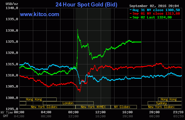 Sáng nay 7:00 theo giờ Việt Nam, giá vàng giao ngay trên sàn Kitco đứng tại 1.324,8USD/oz, tăng 0,85% so với chốt phiên trước.