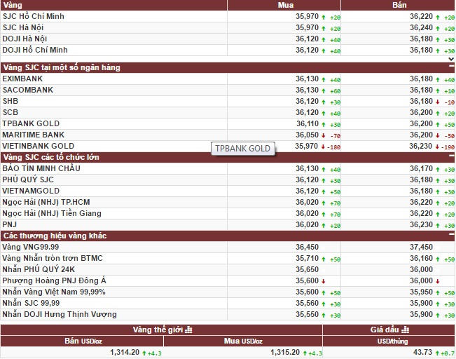 Trong khi đó, giá vàng PNJ của Công ty Vàng bạc đá quý Phú Nhuận giao dịch tại thị trường Hà Nội ở mức 36,02– 36,23 triệu đồng/lượng, và tại thị trường thành phố Hồ Chí Minh là 36,1– 36,3 triệu đồng/lượng (mua vào – bán ra).