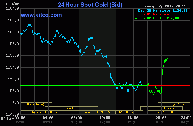 Tính tới đầu giờ sáng 3/1 (giờ Việt Nam), giá vàng thế giới giao ngay đứng ở mức 1.149,7 USD/ounce, giảm so với mức 1.150,9 USD/ounce cuối năm 2016. Giá vàng giao tháng 2 trên sàn Comex New York đứng ở mức 1.151,7 USD/ounce.