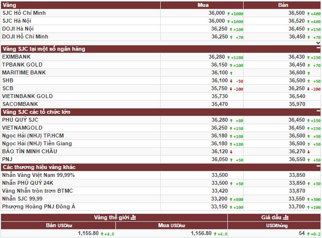 Tương tự, giá vàng SJC do tập đoàn Doji niêm yết tại TP.HCM là 36.300-36.500 triệu đồng/lượng (mua vào-bán ra), tăng đều 120.000 đồng/lượng ở cả hai chiều mua vào; bán ra. Mức giá tại Hà Nội là 36.250-36.450 triệu đồng/lượng (mua vào-bán ra), tăng 100.000 đồng/lượng chiều mua vào và tăng 150.000 đồng/lượng chiều bán ra.