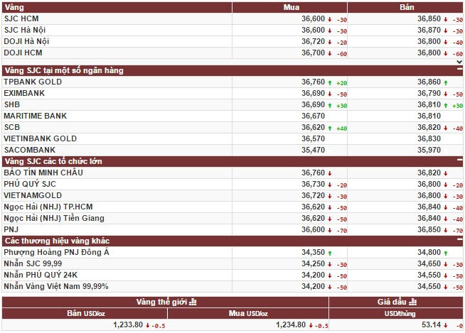 Tập đoàn DOJI niêm yết giá vàng sáng nay ở mức 36,73 – 36,81 triệu đồng/lượng (mua vào – bán ra). So với phiên trước, giá vàng giảm 60.000 đồng/lượng ở cả hai chiều mua – bán. Mức chênh lệch giá bán chỉ cao hơn giá mua 80.000 đồng/lượng.