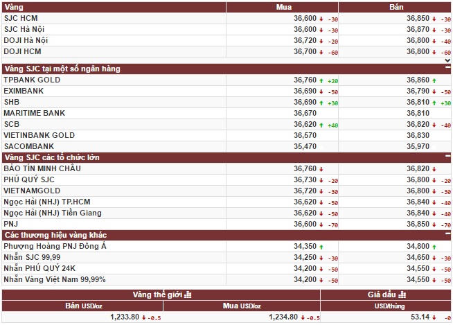 Theo niêm yết giá vàng SJC tại Công ty VBĐQ Sài Gòn sáng nay (6/3), giá mua vàng đang ở mức 36,60 triệu đồng/lượng; giá bán ra là 36,85 triệu đồng/lượng, giảm 30.000 đồng/lượng so với phiên cuối tuần trước, trong khi chênh lệch giá mua – bán giữ ở mức 250.000 đồng/lượng.