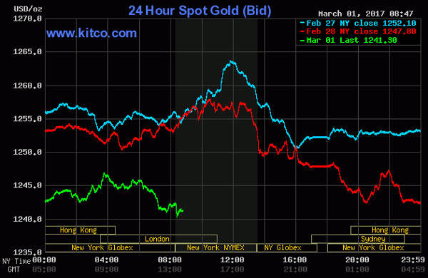 Giá vàng thế giới giao ngay hiện đã giảm về mức 1.240 USD/oz, trong khi giá vàng kỳ hạn của Mỹ cũng giảm tương ứng còn 1.242 USD/oz. Theo tỷ giá ngoại tệ ngày hôm nay, giá vàng thế giới tương đương 33,22 triệu đồng/lượng, thấp hơn giá vàng SJC 3,71 triệu đồng/lượng.
