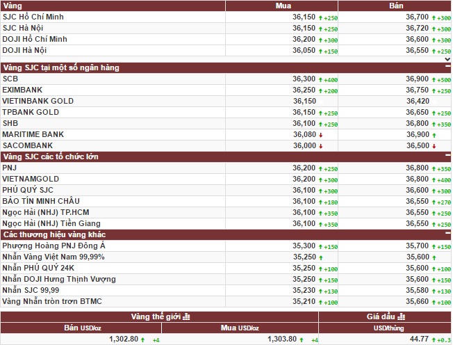 Tập Đoàn Vàng bạc đá quý DOJI niêm yết giá vàng SJC ở mức: 36,20 triệu đồng/lượng (mua vào) và 36,60 triệu đồng/lượng (bán ra). Công ty vàng bạc đá quý Sài Gòn niêm yết vàng SJC ở mức: 36,15 triệu đồng/lượng (mua vào) và 36,72 triệu đồng/lượng (bán ra).