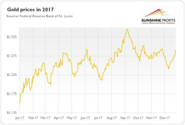 Nhìn lại năm 2017, diễn biến kinh tế, căng thẳng về chính trị và điều hành của tân thổng thống Mỹ đã tạo cho giá vàng tiếp tục một năm toả sáng. Năm 2017 chứng kiến sự ổn định của giá vàng sau ba năm liên tiếp giảm cho đến 2016. Giá vàng đã tăng 12,5% vào năm 2017, mặc dù các nhà đầu tư đã phần nào đổ tiền vào các tài sản khác nhằm ngăn ngừa rủi ro.