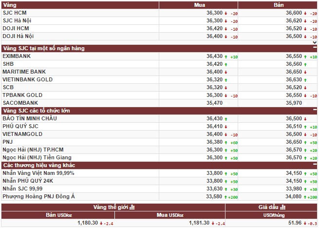 Công ty vàng bạc đá quý Sài Gòn niêm yết ở mức 36,35 triệu đồng/lượng (mua vào) và 36,67 triệu đồng/lượng (bán ra), tăng 30 ngàn đồng/lượng ở cả 2 chiều mua vào và bán ra so với cuối giờ chiều 9/1.