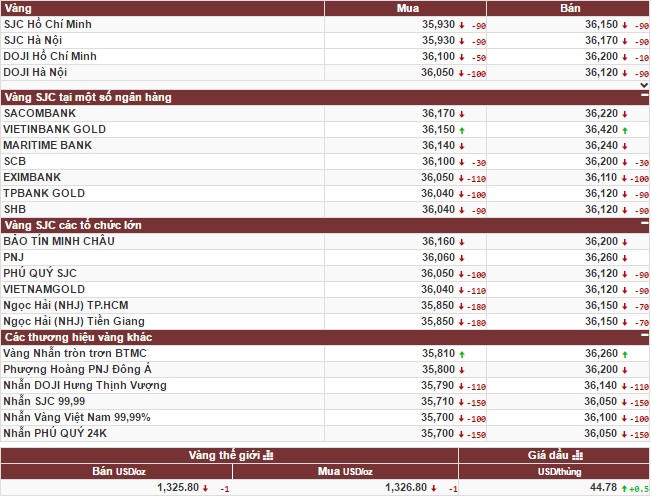 Giá vàng SJC giao dịch tại thị trường Hà Nội tại mức 35,93 - 36,17 triệu đồng/lượng (chiều mua – bán). Tương tự, giá vàng của Bảo Tín Minh Châu cũng được giao dịch quanh mức 36,16 – 36,20 triệu đồng/lượng (chiều mua - bán). Giá vàng SJC Phú Quý hiện đứng ở 36,05 – 36,12 triệu đồng/lượng (mua vào – bán ra).