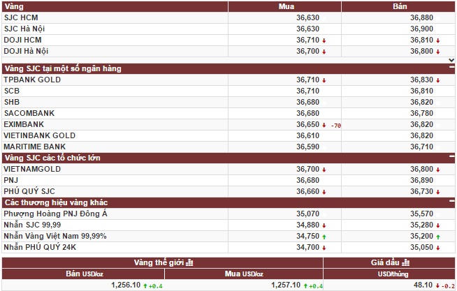 Tại Công ty SJC, giá vàng niêm yết chiều mua vào là 36,63 triệu đồng/lượng, ở chiều bán ra có mức giá là 36,90 triệu đồng/lượng. Tại thị trường TP.HCM, chiều bán ra niêm yết ở mức giá 36,88 triệu đồng/lượng.