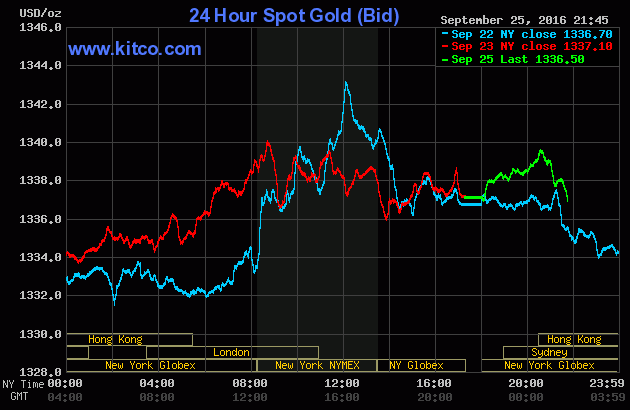 Giá vàng giao ngay trên sàn Kitco đứng tại 1336,5 USD/oz, giảm 0,6 USD, tương đương 0,04% so với chốt phiên trước. Quy đổi theo tỷ giá tại Vietcombank, hiện giá vàng trong nước đắt hơn vàng thế giới 120 nghìn đồng/lượng, mở rộng 20 nghìn đồng so với cuối tuần trước.