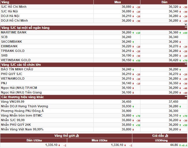 Trong khi đó, công ty TNHH Vàng bạc đá quý Bảo Tín Minh Châu báo giá vàng miếng SJC ở mức 36,24-36,29 triệu đồng/lượng, giảm 10 nghìn đồng/lượng chiều mua vào.