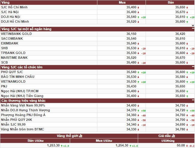 Tại Công ty SJC, giá vàng niêm yết chiều mua vào là 35,40 triệu đồng/lượng, ở chiều bán ra có mức giá là 35,67 triệu đồng/lượng, tăng thêm 10.000 đồng so với cuối tuần. Tại thị trường TP.HCM, chiều bán ra niêm yết ở mức giá 35,65 triệu đồng/lượng.