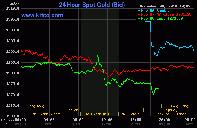 Trước đó, lúc gần 19 giờ ngày 8/11 (giờ Việt Nam), lúc đó cư tri Mỹ bắt đầu đi bỏ phiếu lựa chọn Tổng thống, thị trường tài chính gồm: Vàng, chứng khoán, tiền tệ, chứng khoán đều gần như đứng im cả về giá và khối lượng giao dịch.