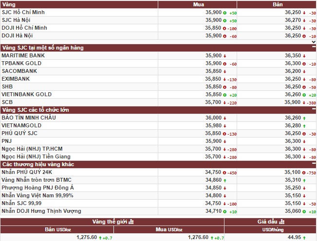 Tập Đoàn Vàng bạc đá quý DOJI niêm yết giá vàng SJC ở mức: 35,90 triệu đồng/lượng (mua vào) và 36,25 triệu đồng/lượng (bán ra). Công ty vàng bạc đá quý Sài Gòn niêm yết vàng SJC ở mức: 35,90 triệu đồng/lượng (mua vào) và 36,30 triệu đồng/lượng (bán ra).