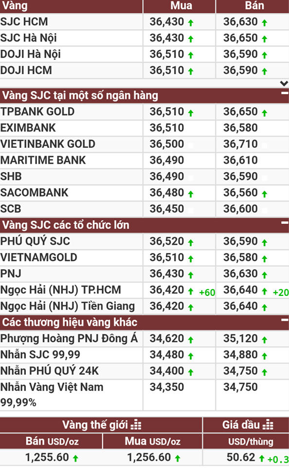 Tại Công ty SJC, giá vàng niêm yết chiều mua vào là 36,43 triệu đồng/lượng, ở chiều bán ra có mức giá là 36,65 triệu đồng/lượng. Tại thị trường TP.HCM, chiều bán ra niêm yết ở mức giá 36,63 triệu đồng/lượng.