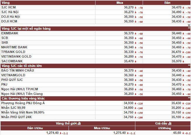 Tại Hà Nội, tập đoàn DOJI niêm yết giá vàng miếng SJC ở mức 36,32 - 36,44 triệu đồng/lượng, giảm 50.000 - 70.000 đồng/lượng. Giá vàng SJC tại Bảo Tín Minh Châu niêm yết ở mức: 36,42 – 36,48 triệu đồng/lượng, tuy giảm so với cùng thời điểm phiên liền trước nhưng nhích lên 10.000đồng/lượng so với chốt phiên hôm qua.