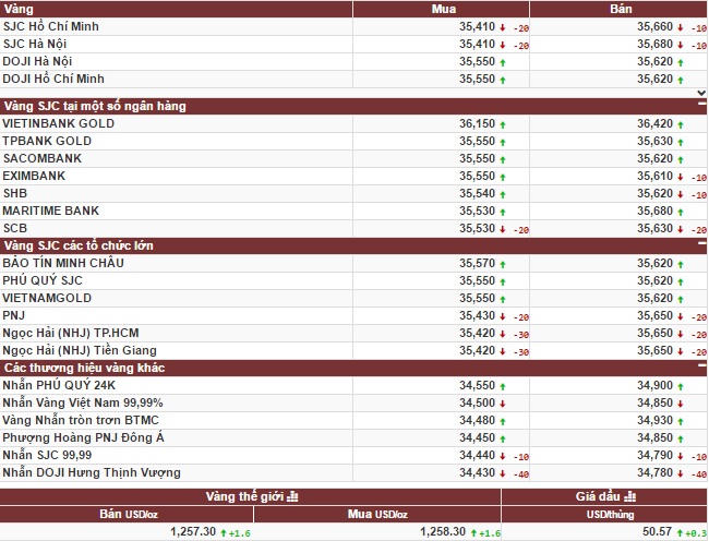 Cùng thời điểm, Công ty vàng bạc đá quý Sài Gòn niêm yết giá vàng miếng SJC tại TP HCM ở mức 35,41 triệu đồng/lượng (mua vào)và 35,66 triệu đồng/lượng (bán ra), giảm 10.000 đồng/lượng ở cả 2 chiều mua và bán so cuối giờ chiều 13/10.
