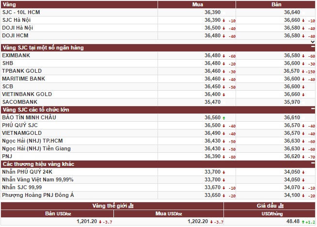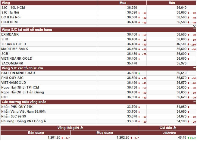 Tại khu vực thành phố Hồ Chí Minh niêm yết ở mức: 36,48 triệu đồng/ lượng (mua vào) và 36,58 triệu đồng/ lượng (bán ra), giảm 40 ngàn đồng ở cả 2 chiều mua vào và bán ra.