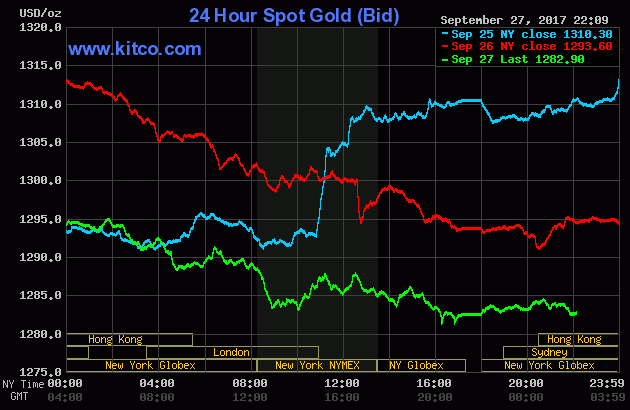 Tới đầu giờ sáng 28/9 (giờ Việt Nam), giá vàng thế giới giao ngay đứng ở mức 1.289 USD/ounce, giảm 10,7 USD, tương đương 0,83% so với chốt phiên trước.