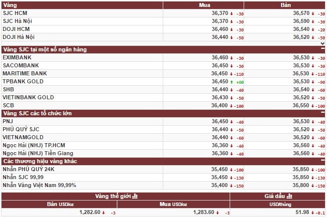 Công ty vàng bạc đá quý Sài Gòn niêm yết giá vàng SJC ở mức 36,37 triệu đồng/lượng (mua vào) và 36,59 triệu đồng/lượng (bán ra), giảm 30 ngàn đồng/lượng ở cả 2 chiều mua vào và bán ra so với cuối giờ chiều ngày 27/9.