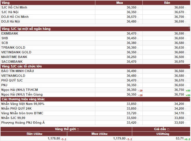 Giá vàng trong nước niêm yết ngày hôm qua được Tập Đoàn Vàng bạc đá quý DOJI niêm yết ở mức: 36,43 triệu đồng/lượng (mua vào) và 36,55 triệu đồng/lượng (bán ra).Công ty vàng bạc đá quý Sài Gòn niêm yết ở mức 36,30 triệu đồng/lượng (mua vào) và 36,62 triệu đồng/lượng (bán ra).